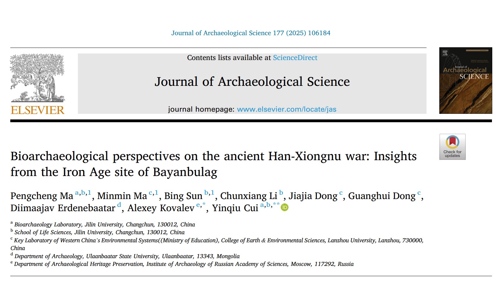 、生物考古实验室崔银秋教授团队联合俄罗斯科学院考古研究所和兰州大学等国内外研究机构,通过整合基因组学、同位素化学、人类学与考古学等多学科数据,系统揭示了汉匈战争时期士兵的遗传背景、地理来源及军事组织模式。研究论文"Bioarchaeological perspectives on the ancient Han-Xiongnu war: Insights from the Iron Age site of Bayanbulag"于2月20日发表于国际权威期刊《Journal of Archaeological Science》。