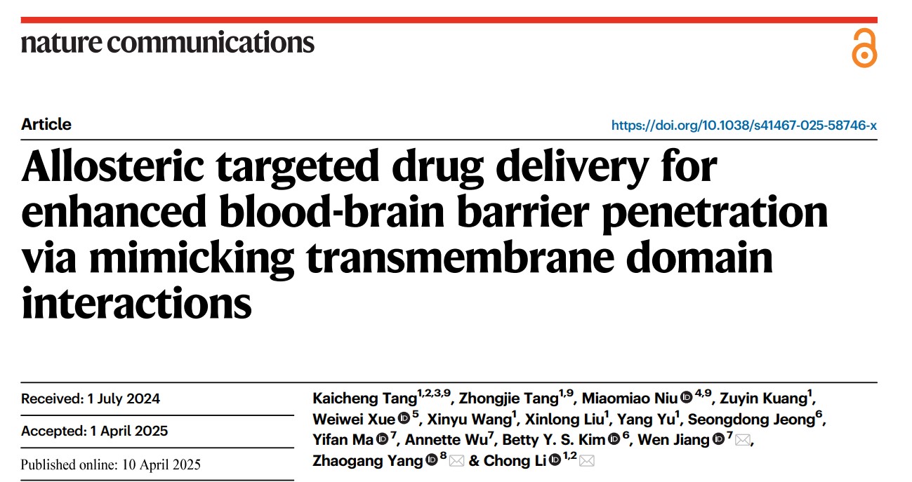 针对脑部主动靶向配体与血脑屏障(BBB)上特定受体相互作用易受多重因素干扰,进而限制药物递送效率的挑战,研究团队与西南大学药学院合作,创新性地提出一种变构靶向药物递送策略。该策略通过设计可特异性结合BBB经典跨膜受体结构域的肽类配体,并采用“即插即用”方式,使其自发嵌入脂质载体的磷脂双分子层中,从而实现对相关受体的高效、精准靶向。此项重要研究成果已发表于国际权威期刊《Nature Communications》。论文第一完成单位为西南大学,吉林大学杨照罡教授与德州大学安德森癌症中心姜闻教授以及西南大学李翀教授为共同通讯作者。