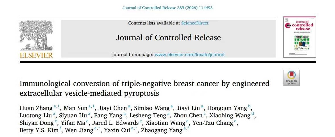 面对更为棘手的三阴性乳腺癌,团队设计并构建了工程化细胞外囊泡pTGDEV。该载体能同时装载诱导癌细胞焦亡的mRNA与抑制免疫排斥的shRNA,并修饰肿瘤细胞靶向抗体与pH敏感肽。这一精巧设计实现了药物在肿瘤部位的精准释放,有效诱导癌细胞死亡并改善免疫微环境,延长了小鼠生存期。相关研究成果已正式发表于国际权威期刊《Journal of Controlled Release》。生科院博士生张欢、孙漫为论文共同第一作者,德州大学安德森癌症中心姜闻教授、生科院崔雅欣博士以及杨照罡教授为通讯作者。