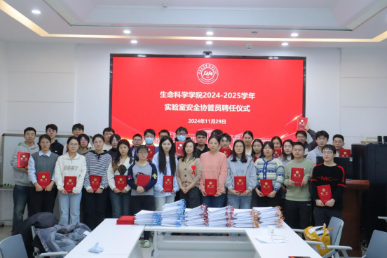 郑琳和温少忠为35名2024-2025学年新聘实验室安全协管员同学颁发聘书,并与同学们合影留念。