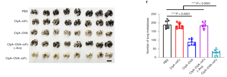 基于 OMV 的种种优势,聂广军团队和赵潇团队于2021年4月在Nature Communications期刊发表论文【2】,提出并开发了一种基于 OMV 的通用肿瘤疫苗平台,将肿瘤抗原与OMV 表面的ClyA 蛋白融合,从而在 OMV 表面展示肿瘤抗原,用以诱导肿瘤抗原特异性抗肿瘤免疫反应。这也为后续的口服肿瘤疫苗的开发奠定了基础。